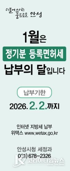 코리아타임뉴스 경기취재본부 | 안성시는 2026년도 정기분 등록면허세(면허분) 4만 2,100건에 대해 총 5억 5천만 원을 부과했다고 밝혔다.