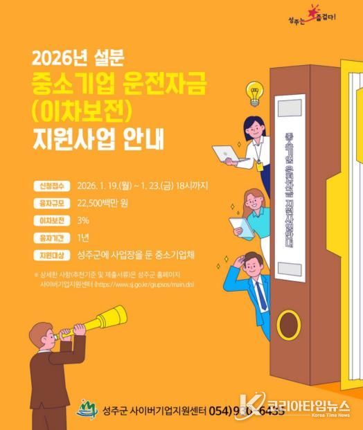 코리아타임뉴스 박찬식 기자 | 성주군은 설 명절을 앞두고 관내 중소기업의 자금 부담 완화를 위해 2026년도 중소기업 운전자금(이차보전) 설 명절분을 225억원 규모로 지원한다.