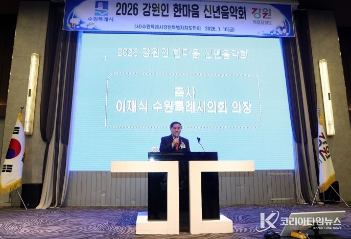 코리아타임뉴스 윤광희 기자 | 수원특례시의회는 1월 16일수원컨벤션센터에서 열린 '2026 강원인 한마음 신년음악회'에 참석했다. 이번 행사는 수원특례시 강원특별자치도민회가 주최한 신년 행사로, 이재식 의장을 비롯한 내빈과 강원 출신 시민 등 약 250여 명이 참석한 가운데 신년음악회, 표창 수여, 만찬 등의 순서로 진행됐다.