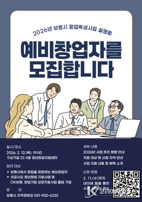 코리아타임뉴스 충남취재본부 | 보령시는 오는 2월 12일 오후 7시 청년창업지원센터에서 예비창업자 및 창업기업을 대상으로 ‘2026년 창업육성사업 설명회’를 개최한다.