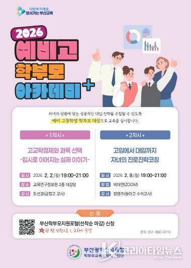 코리아타임뉴스 사회팀 | 부산광역시교육청은 자녀의 상급학교 진학을 앞둔 예비 초·중·고 학부모의 불안감을 해소하고, 변화하는 학교생활과 교육과정에 대한 이해를 돕기 위해 다음달 2일부터 '학부모 아카데미+(플러스)' 예비과정을 운영한다고 밝혔다.