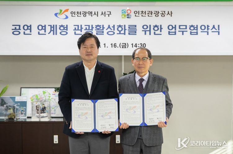 코리아타임뉴스 사회팀 | 인천 서구는 지난 16일 인천관광공사(사장 유지상)와 ‘공연 연계형 관광 활성화를 위한 업무협약’을 체결했다고 밝혔다.