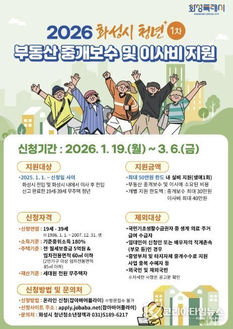 코리아타임뉴스 사회팀 | 화성특례시가 19일부터 3월 6일까지 청년들의 주거비 부담 경감 및 정주 여건 향상을 위한 ‘2026년 상반기 청년 부동산 중개보수 및 이사비 지원사업’ 신청을 받는다.