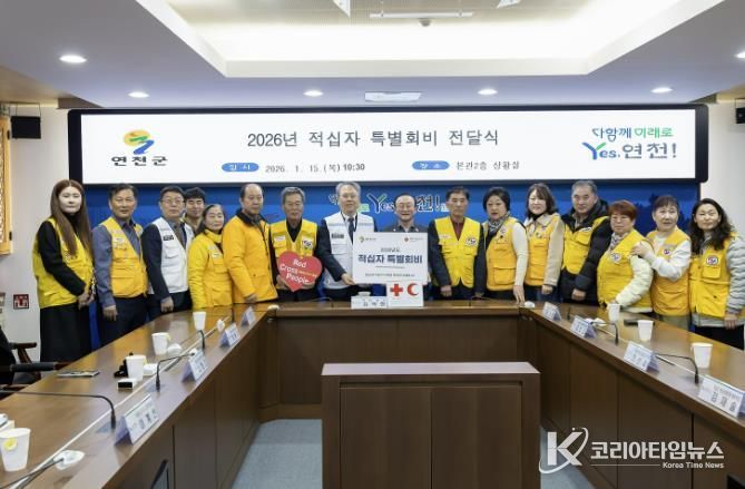 코리아타임뉴스 윤광희 기자 | 연천군은 지난 15일 군청 상황실에서 연천군수, 대한적십자사 경기도지사 우광호 사무처장, 연천군협의회 금가현 회장 및 회원 등이 참석한 가운데 2026년 적십자 특별회비 전달식을 개최했다.