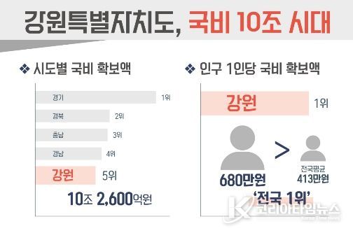 코리아타임뉴스 김택호 기자 | 강원특별자치도는 국비 확보 10조 시대에 진입한 가운데, 인구 1인당 국비 확보액이 약 680만 원으로 전국 1위에 해당한다고 밝혔다.