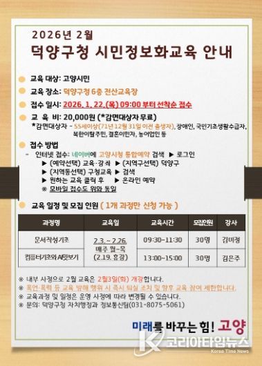 코리아타임뉴스 기동취재팀 | 고양특례시 덕양구는 고양시민의 디지털 역량 강화를 위해 ‘2026년 제1차 덕양구 시민정보화교육’ 수강생을 오는 22일부터 모집한다고 밝혔다.
