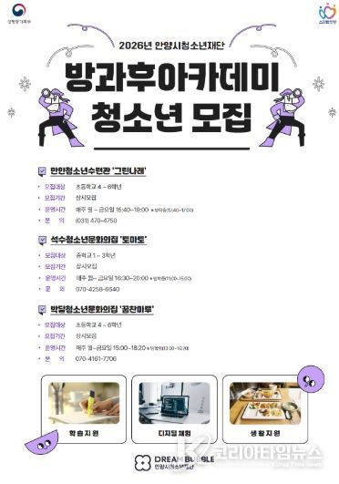 코리아타임뉴스 사회팀 | 안양시청소년재단은 공공 청소년 돌봄 사업인 청소년방과후아카데미의 2026년도 참여 청소년을 모집한다.