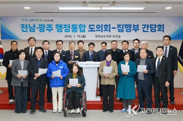 코리아타임뉴스 노승선 기자 | 전라남도의회는 19일 도의회에서 김영록 전라남도지사와 김대중 전라남도교육감이 참여한 가운데 ‘전남·광주 행정통합 도의회–집행부 간담회’를 열고, 통합 추진 방향과 주요 쟁점에 대해 심도 있는 논의를 진행했다.