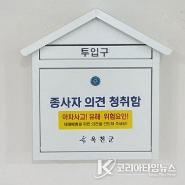 코리아타임뉴스 충북취재본부 | 옥천군은 종사자의 안전·보건을 보다 체계적으로 관리하고, 현장의 다양한 목소리를 폭넓게 수렴해 군정에 적극 반영하기 위해 군청 및 읍·면사무소 등 주요 공공시설 16개소에 총 21개의 종사자 의견청취함을 설치·운영한다고 밝혔다.