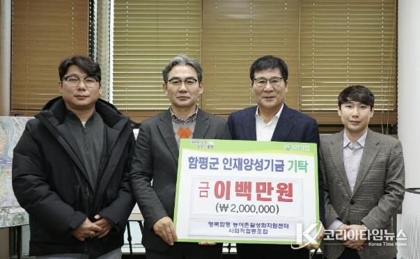 코리아타임뉴스 노승선 기자 | 전남 함평군은 “지난 19일 행복함평 농어촌활성화지원센터 사회적협동조합이 함평군 인재양성기금에 200만원을 기탁했다”고 20일 밝혔다.