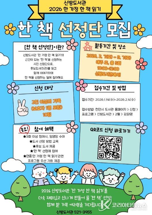 코리아타임뉴스 김택호 기자 | 천안시 신방도서관은 ‘한 책 선정단’ 참여 가족을 모집한다고 20일 밝혔다.