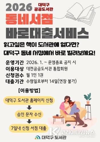 코리아타임뉴스 대전취재본부 | 대전 대덕구는 2026년 공공도서관 ‘동네서점 바로대출 서비스’를 운영한다고 밝혔다.