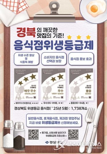 코리아타임뉴스 의료보건팀 | 영주시보건소(소장 김문수)는 시민이 안심하고 외식할 수 있는 환경을 조성하기 위해 음식점 위생등급제 참여 업소를 연중 상시 모집하며, 위생 관리 수준 향상에 힘쓰고 있다.