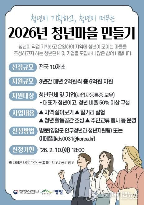 코리아타임뉴스 노승선 기자 | 영암군이 행정안전부 ‘2026 청년 마을 만들기 사업’에 참여할 청년단체를 다음달 10일까지 공개 모집한다.