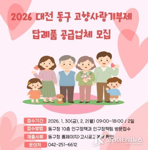 코리아타임뉴스 대전취재본부 | 대전 동구는 이달 30일부터 다음 달 2일까지 주말을 제외한 이틀간, ‘2026년 고향사랑기부제 답례품 공급업체’를 추가 공개 모집한다고 20일 밝혔다.