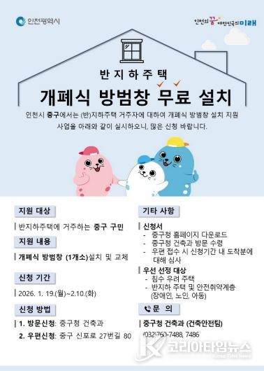 코리아타임뉴스 이아름 기자 | 인천시 중구는 올해에도 반지하주택을 대상으로 ‘개폐식 방범창’ 설치를 무상 지원하며, 침수 피해 예방에 나선다고 20일 밝혔다.
