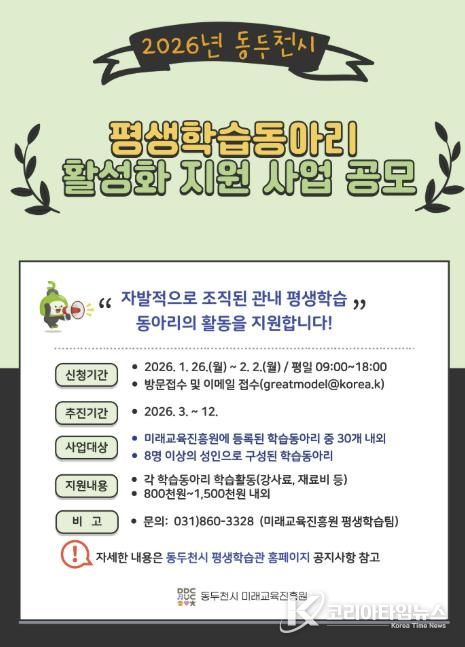 코리아타임뉴스 경기취재본부 | 동두천시는 오는 1월 26일부터 2월 2일까지, 시민 주도형 평생학습 문화 확산을 위해 ‘2026년 평생학습 동아리 활성화 지원사업’에 참여할 학습동아리를 모집한다고 밝혔다.