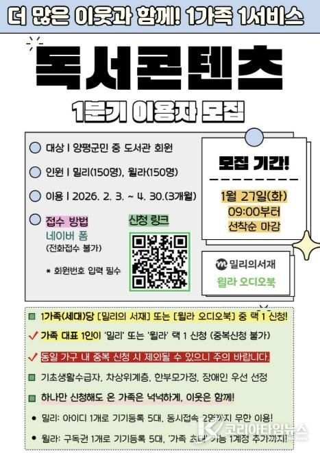 코리아타임뉴스 기동취재팀 | 양평군은 오는 27일부터 군민들이 시간과 장소에 구애받지 않고 독서를 즐길 수 있도록 ‘2026년 온라인 구독형 독서 콘텐츠 이용 지원 사업’을 시작한다고 밝혔다.