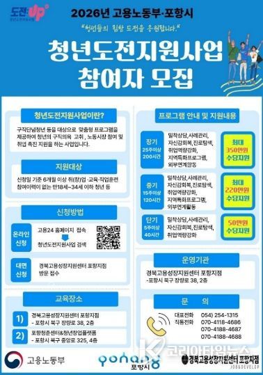 코리아타임뉴스 박찬식 기자 | 포항시는 장기간 미취업 상태이거나 구직에 어려움을 겪는 청년들의 노동시장 복귀를 지원하기 위해 ‘2026 청년도전지원사업’ 참여자를 선착순 모집한다.