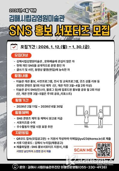 코리아타임뉴스 오영주 기자 | 김해시는 오는 2026년 4월 개관 예정인 ‘김해시립김영원미술관’을 알리고, 미술관의 개관 과정을 생생하게 기록하고 홍보할 'SNS 홍보 서포터즈'를 모집한다고 밝혔다.