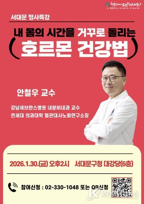 코리아타임뉴스 노승선 기자 | 서대문구가 연세대 의대 강남세브란스병원 내분비내과 안철우 교수를 초청해 이달 30일 오후 2시부터 90분간 구청 6층 대강당에서 ‘1월 서대문 명사 특강’을 개최한다.