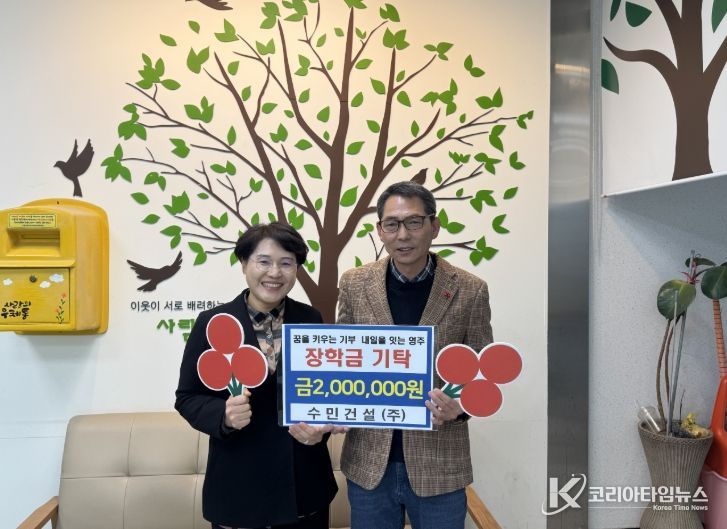 코리아타임뉴스 노승선 기자 | 영주시 수민건설 주식회사(대표 김효식)는 지난 20일 가흥1동 행정복지센터(동장 안순기)를 방문해 새로운 세상을 향해 첫발을 내딛는 예비 대학생을 위한 ‘응원 장학금’ 200만 원을 기탁했다.