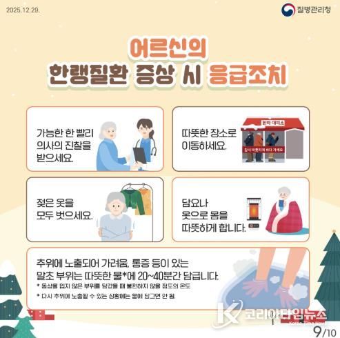 모든 도민에게는 ▲추운 날씨에 장시간 야외 활동 자제 ▲젖은 옷 즉시 교체 ▲음주 후 야외 노출 금지 ▲한파 시 실내 적정온도 유지 ▲한랭질환 의심 증상 발생 시 즉시 의료기관 방문 등 기본 예방 수칙 준수를 강조했다.