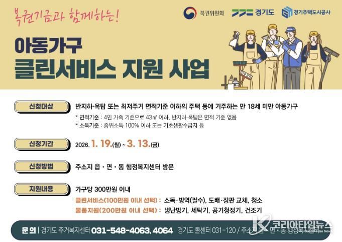 지원 대상은 최저주거기준 미달 주택 또는 반지하·옥탑 등 열악한 주거환경에 거주하는 만 18세 미만 저소득 아동 가구다.