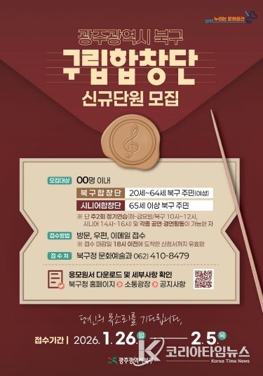코리아타임뉴스 노승선 기자 | 광주광역시 북구가 아름다운 목소리로 주민들과 소통하는 구립합창단 신규 단원을 모집한다고 21일 밝혔다.