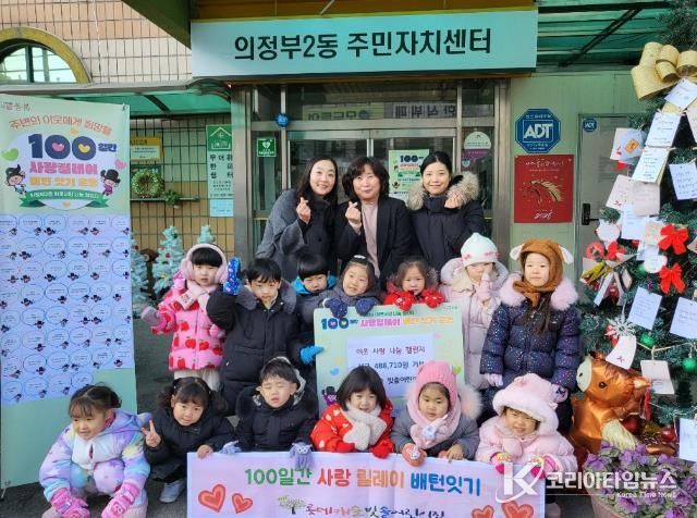 코리아타임뉴스 기동취재팀 | 의정부시 의정부2동주민센터는 1월 20일 롯데캐슬 빛솔 어린이집이 ‘100일간 사랑릴레이 배턴 잇기’에 동참해 취약계층을 위한 성금 48만8천710원을 전달했다고 밝혔다.