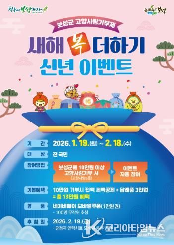 코리아타임뉴스 노승선 기자 | 보성군은 2026년 새해를 맞아 고향사랑기부제 참여를 확대하고 기부 문화를 활성화하기 위해 오는 2월 18일까지 ‘새해 복 더하기 신년 이벤트’를 추진한다고 밝혔다.