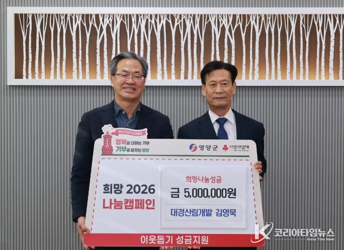 코리아타임뉴스 노승선 기자 | 대경산림개발 대표 김영묵(전 농업경제건설국장)은 1월 21일 영양군을 방문해 지역의 어려운 이웃과 희망을 나누고자 성금 500만원을 기부하며 '희망2026나눔캠페인'에 동참했다.