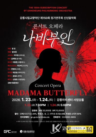 코리아타임뉴스 노승선 기자 | 강릉시립교향악단은 2026년의 첫 정기연주회로 오는 23일(금) 19시 30분, 24일(토) 17시 강릉아트센터 사임당홀에서 콘서트 오페라‘나비부인’을 선보인다.