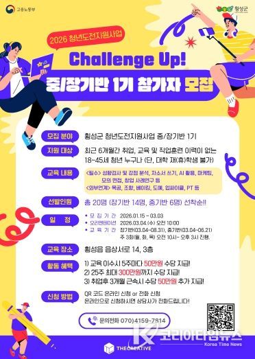 코리아타임뉴스 윤경수 기자 | 횡성군은 지역 청년들의 사회 진출과 성장을 지원하기 위해 ‘2026 청년도전지원사업’ 참여자를 모집한다고 밝혔다.