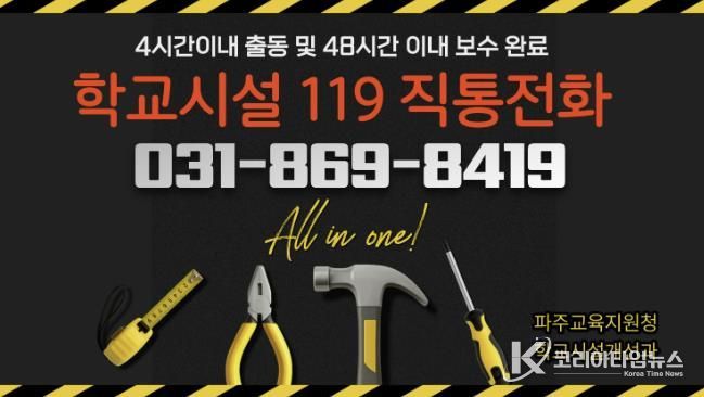 코리아타임뉴스 사회팀 | 파주교육지원청이 학교 현장의 시설 관리 부담을 덜기 위해 ‘학교시설 119’ 서비스를 2026년부터 대폭 강화한다고 21일 밝혔다. 이번 개편의 핵심은 ‘접근성’과 ‘신속성’이다.