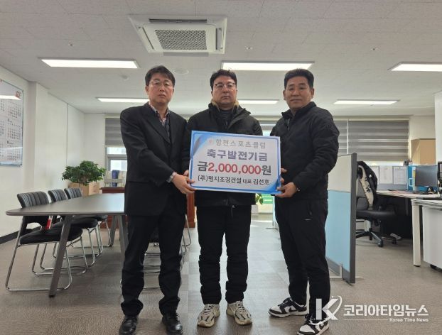 코리아타임뉴스 노승선 기자 | 합천군 합천읍 소재 명지조경건설(대표 김선호)은 20일 합천스포츠클럽 사무실을 방문해 유소년 축구부 육성을 위한 발전기금 200만원을 기탁했다.