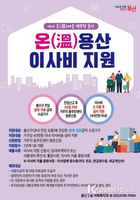 코리아타임뉴스 노승선 기자 | 서울 용산구는 기초생활수급가구의 주거 안정을 도모하고 이사에 따른 경제적 부담을 완화하기 위해 ‘온(溫)용산 이사비 지원’ 사업을 시행한다고 밝혔다.