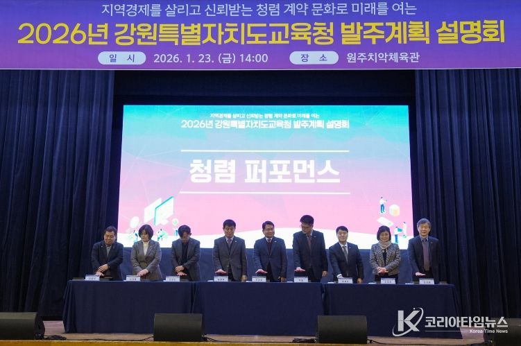 코리아타임뉴스 사회팀 | 강원특별자치도교육청은 23일 원주 치악체육관에서 청렴한 계약문화 확산과 지역경제 상생을 위한 ‘2026년 공사·용역·물품 발주계획 설명회’를 개최했다.