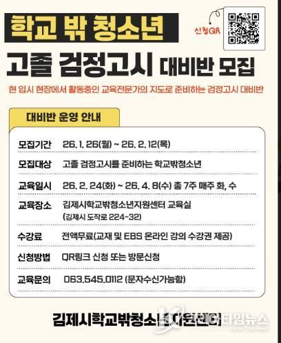 코리아타임뉴스 전북취재본부 | 김제시는 학교밖청소년지원센터(꿈드림)가 학교 밖 청소년의 학력 취득을 지원하기 위해 2026년 고졸 검정고시 대비반을 운영한다고 밝혔다.