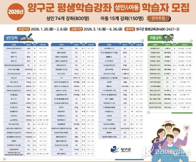 코리아타임뉴스 이아름 기자 | 양구군은 1월 26일부터 2월 6일까지 12일간 상반기 평생교육 프로그램 학습자를 모집한다.