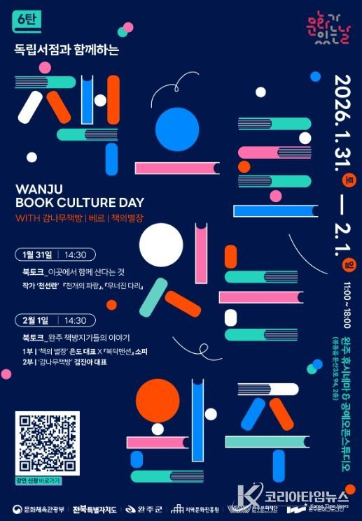 코리아타임뉴스 전북취재본부 | 완주문화재단은 오는 1월 31일부터 2월 1일까지 이틀간 완주 휴시네마와 공예오픈스튜디오에서 '문화가 있는 날 6탄 – 책으로 잇는 완주'를 개최한다.