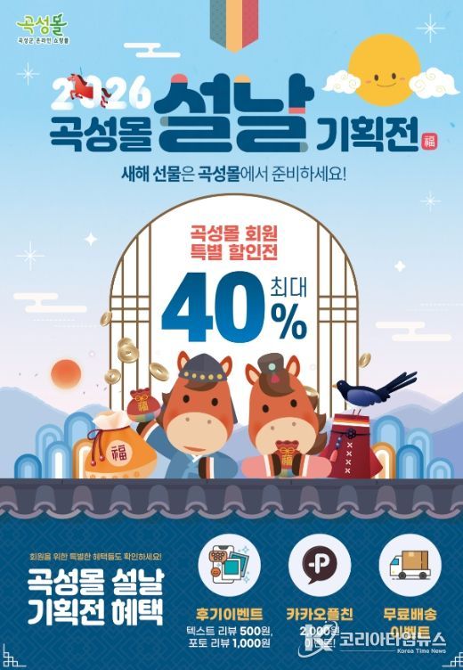 코리아타임뉴스 김태훈 기자 | 전남 곡성군은 설 명절을 맞아 온라인 쇼핑몰 곡성몰에서 곡성몰 福(복) 가득 최대 40% 할인 특별전을 운영한다고 26일 밝혔다.