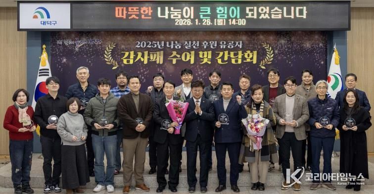 대덕구는 26일 구청 대회의실에서 2025년 어려운 이웃돕기에 적극 참여한 나눔 실천 유공자들을 대상으로 감사패 수여식과 간담회를 개최했다.