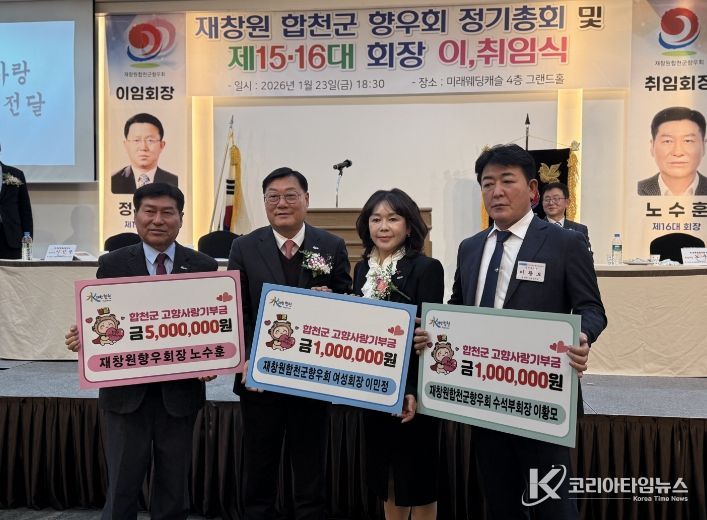 이날 행사에서는 제16대 노수훈 신임 회장이 고향사랑기부금 500만 원을 기탁했으며, 재창원합천군향우회 이민정 여성회장과 이황모 수석부회장도 각각 100만 원씩을 기탁해 고향 발전에 힘을 보탰다.