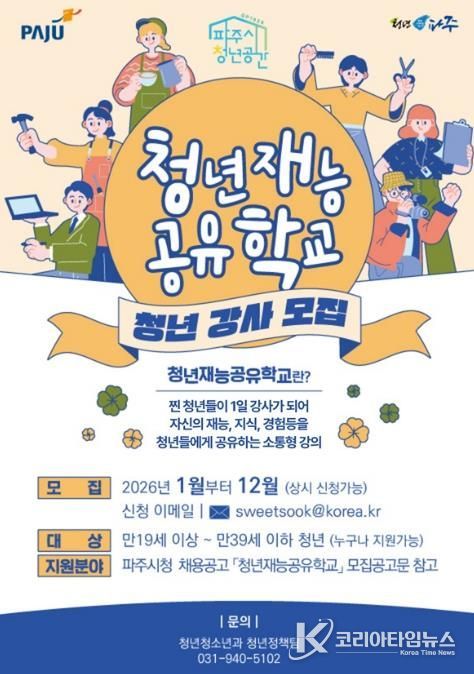 코리아타임뉴스 윤광희 기자 | 파주시는 2026년 1월부터 12월까지 청년을 대상으로 '청년재능공유학교' 청년강사를 연중 상시 모집한다.