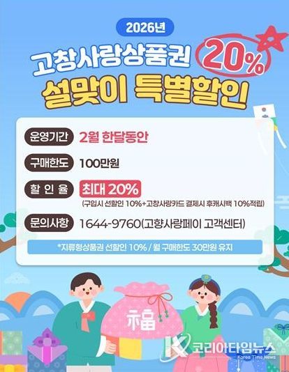 코리아타임뉴스 전북취재본부 | 고창군이 2월 한 달간 고창사랑상품권 최대 20% 할인 판매를 실시한다.