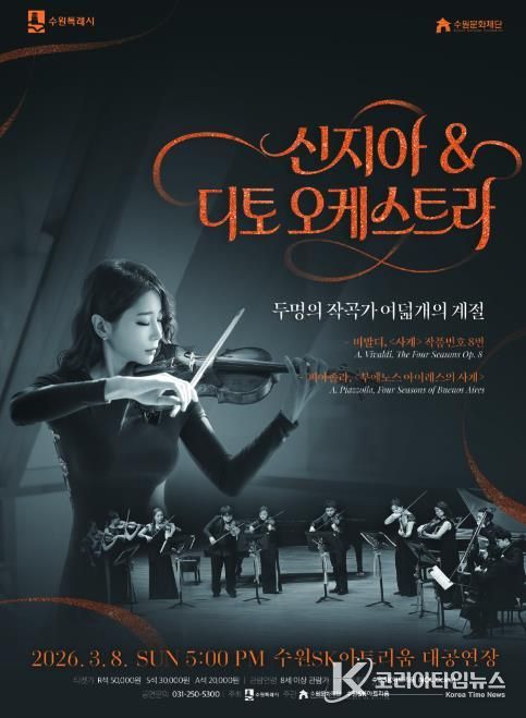 수원문화재단은 비발디와 피아졸라의 명작 ‘사계’를 한 무대에서 만나는 '신지아&디토오케스트라'를 오는 3월 8일 일요일 오후 5시 수원SK아트리움에서 개최한다.