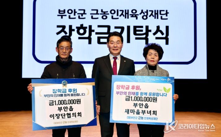 코리아타임뉴스 전북취재본부 | 부안군은 지난 26일 부안예술회관 공연장에서 열린 부안읍 2026년 결실창래 군민과의 희망소통대화 행사에서 부안읍 이장단협의회와 부안읍 새마을부녀회가 부안군 근농인재육성장학금 100만원씩을 각각 기탁했다고 밝혔다.