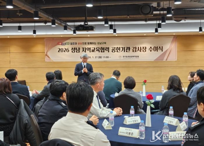 코리아타임뉴스 사회팀 | 경기도성남교육지원청은 1월 27일 스카이파크 호텔에서 '성남 지역교육협력 공헌기관 감사장 수여식'을 개최하여 성남교육 발전을 위해 협력해 온 지역교육협력기관 22곳에 감사의 뜻을 전했다.