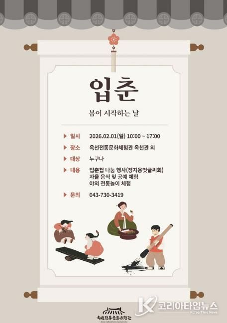 코리아타임뉴스 충북취재본부 | 옥천전통문화체험관은 우리 고유의 전통 세시풍속인 입춘(立春, 양력 2월 4일경)을 맞아 오는 2월 1일(일) ‘입춘 맞이 행사’를 개최한다.